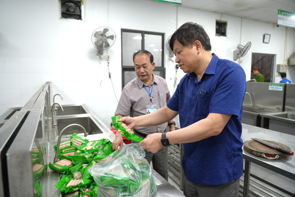 Lãnh đạo Sở Y tế kiểm tra nguồn gốc xuất xứ và hạn sử dụng của sản phẩm tại cơ sở cung cấp suất ăn trên địa bàn phường Đông Triều. Ảnh: Tuấn Anh