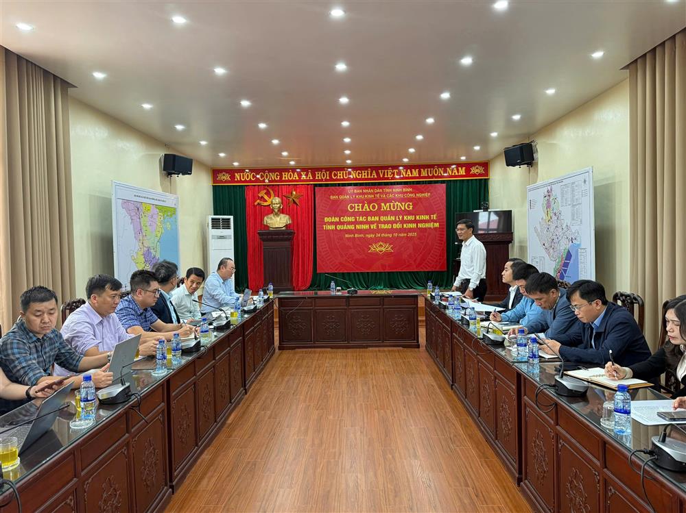 Trong hai ngày 24 và 25 tháng 10 năm 2025, đoàn công tác của Ban Quản lý Khu kinh tế Quảng Ninh do ông Châu Thành Hưng – Phó Trưởng Ban Quản lý Khu kinh tế Quảng Ninh làm Trưởng đoàn đã có chuyến công tác làm việc, trao đổi và học tập kinh nghiệm về công tác quản lý khu công nghiệp, khu kinh tế tại tỉnh Ninh Bình.