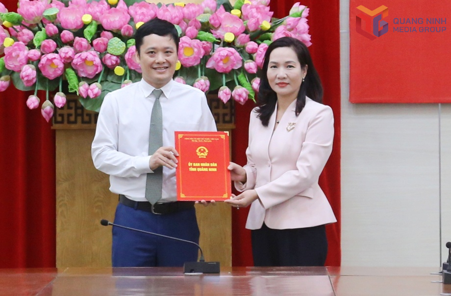 (Đồng chí Nguyễn Thị Hạnh, Phó Chủ tịch UBND Tỉnh trao quyết định cho đồng chí Bùi Tuấn Anh).