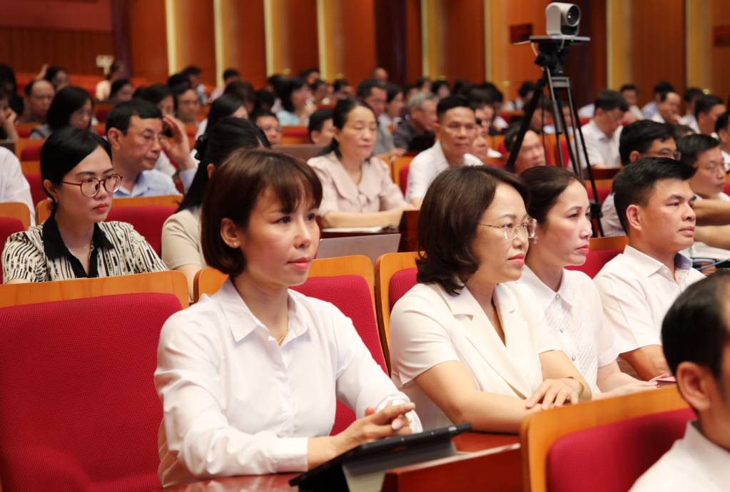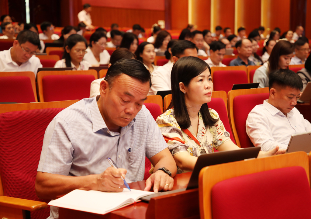 Cán bộ, đảng viên chăm chú lắng nghe, ghi chép tại hội nghị.