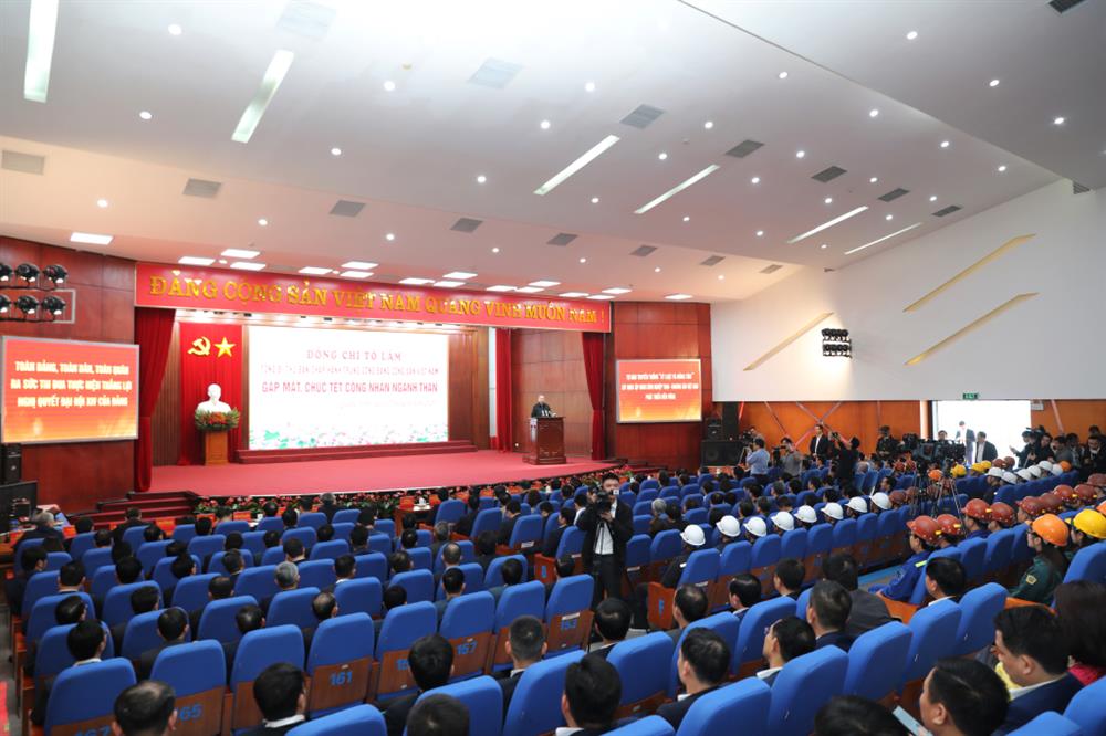 Quang cảnh hội trường Tổng Bí thư Tô Lâm và Đoàn công tác đến thăm, động viên, chúc Tết công nhân ngành Than.