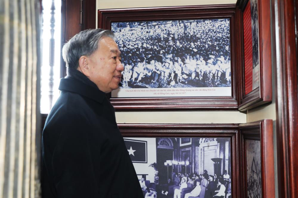 Tổng Bí thư Tô Lâm xem hình ảnh lưu niệm của Bác Hồ tại Khu Di tích lịch sử quốc gia Địa điểm lưu niệm Bác Hồ về thăm mỏ Đèo Nai.