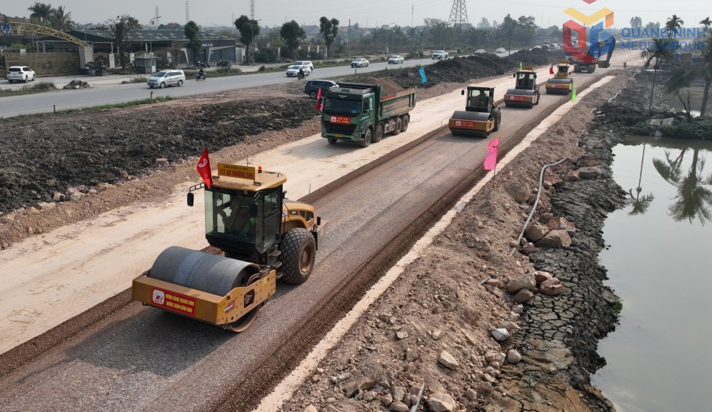 Thi công cấp phối nền đường tại Dự án đường ven sông (đoạn từ tỉnh lộ 338 đến khu vực Đông Triều) trong mùng 4 Tết. Ảnh: Đỗ Phương